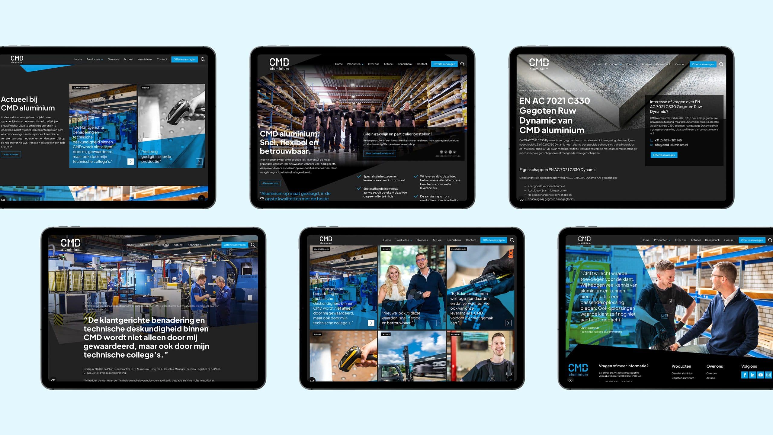 Bekijk project ↗Aluminiumzagers concurreren op levertijd, prijs en precisie — drie variabelen waarin iedereen claimt te excelleren. CMD Aluminium staat dertig jaar bekend om snelheid, flexibiliteit en betrouwbaarheid, maar die reputatie was nog geen merk. De nieuwe identiteit werd gebouwd rond één letterlijk strategische keuze: een zaagsnede die dwars door het logo gaat en twee gelijke helften achterlaat. Die symmetrie is geen decoratie - ze is alleen mogelijk bij exacte precisie, en verbeeldt tegelijk de gelijkwaardige relatie tussen leverancier en klant.