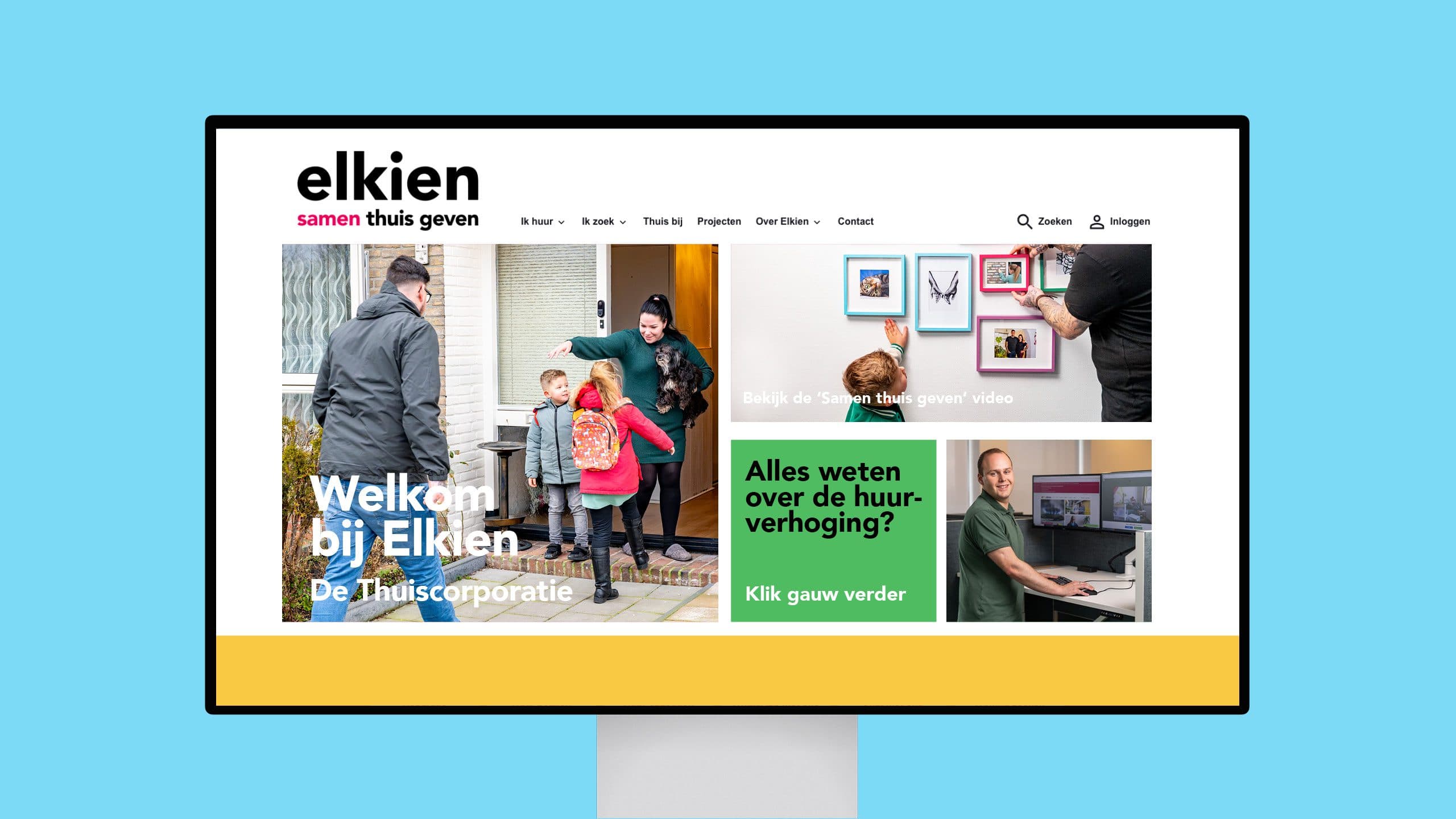 Bekijk project ↗Woningcorporaties presenteren zichzelf via stenen: nieuwbouwplannen, renovaties, duurzaamheidscijfers. Elkien zocht een positie die voorbij het bouwen reikt, omdat de missie dat ook deed. Niet: huizen leveren, maar thuis geven. Het inzicht dat richting gaf: een huis wordt pas een thuis wanneer er foto's aan de muur hangen — het moment waarop de bewoner het gebouw overschrijft met een eigen verhaal. Dat werd de kern van het concept.