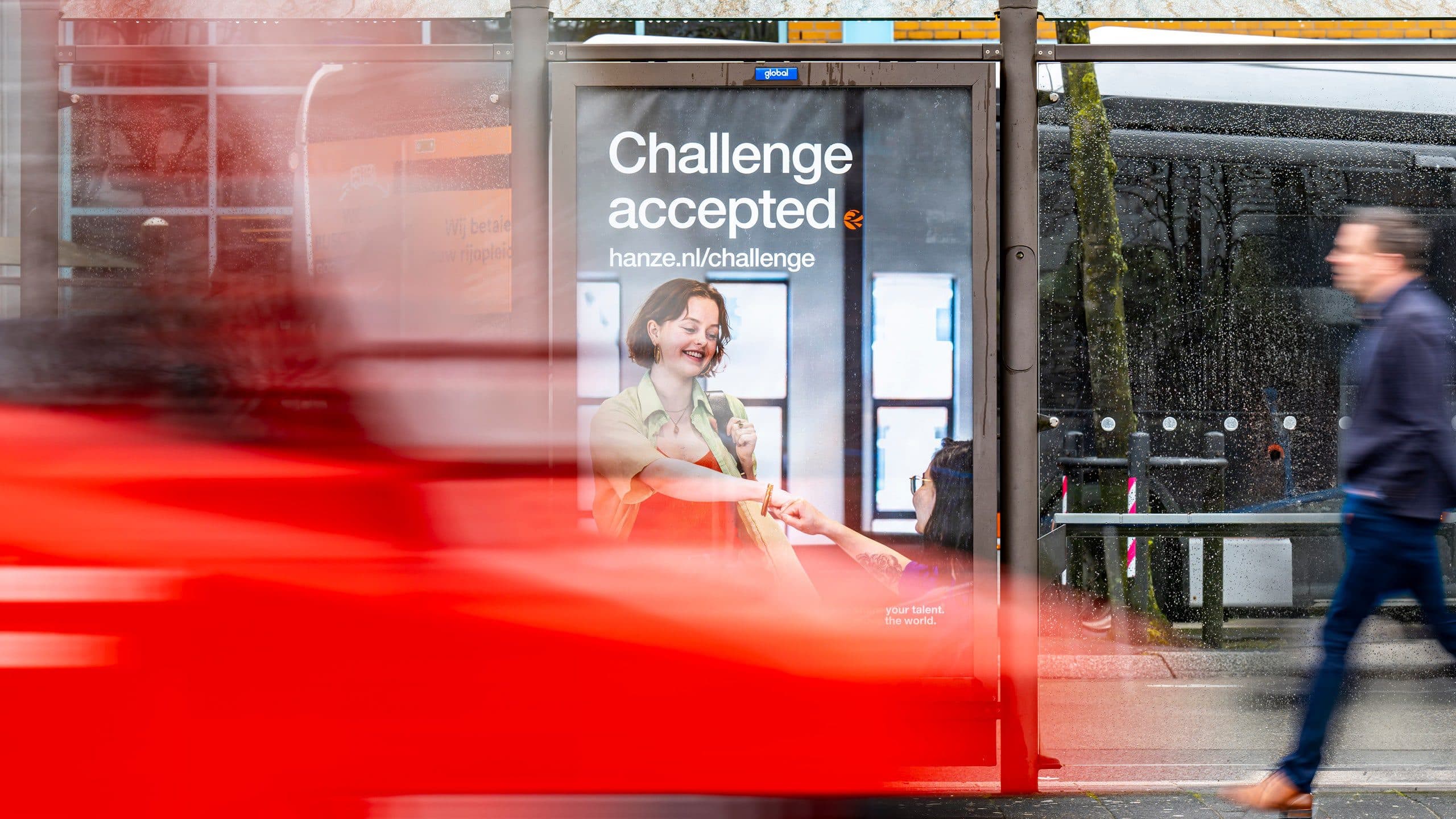 Bekijk project ↗Onderwijsinstellingen werven studenten meestal met beloftes over wat het je oplevert: een diploma, een carrière, een netwerk. De Hanze koos de omgekeerde positie: niet wat je krijgt, maar wat je aangaat. De herpositionering van traditioneel onderwijsinstituut naar kennisinstelling vroeg om een campagne die studentenwerving en maatschappelijke positionering samen kon laten vallen. Challenge accepted deed dat door dezelfde uitnodiging aan beide kanten te doen: de wereld stelt vragen, de Hanze zegt ja. Abri-beelden over klimaat, landbouw en persoonlijke ontwikkeling brachten de uitdagingen zichtbaar in de publieke ruimte; online maakte de Hanze concreet wat dat ja betekent.