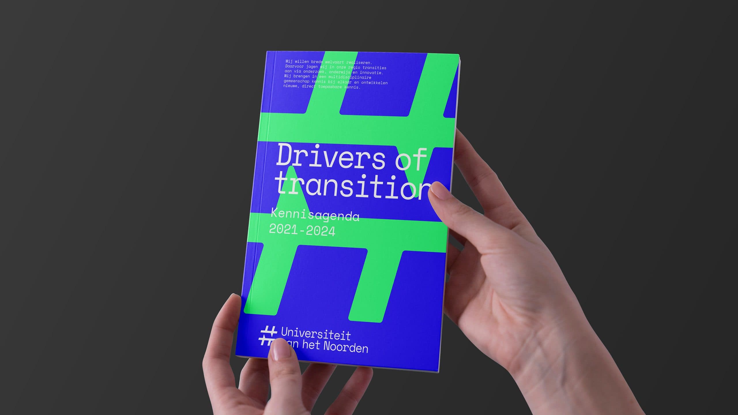 Bekijk project ↗Vijf kennisinstellingen die samen één merk vormen, staan voor een bekend probleem: elke partner is zelf al een sterk merk, en elk samenwerkingsverband dreigt óf vaag óf hiërarchisch te worden. De Universiteit van het Noorden moest een positie claimen die de vijf partijen optelt zonder ze gelijk te trekken - een coalitiemerk, geen koepelmerk. De hashtag werd de strategische vondst: het universele symbool voor verschillende partijen die zich rondom één onderwerp verbinden.