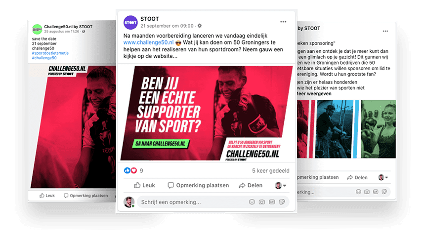 Uit de merkidentiteitsessies kwam het principe bovendrijven: focus op wat wél kan. De visuele identiteit is daar een directe vertaling van - frisse, sportieve vormtaal, schuine lijnen die beweging dragen, persoonlijke fotografie van deelnemers in actie. Het merk toont de uitkomst van de missie, niet de aanleiding. Challenge50 - vijftig Groningse bedrijven voor vijfhonderd jongeren in beweging - maakt die positie direct inzetbaar voor werving.