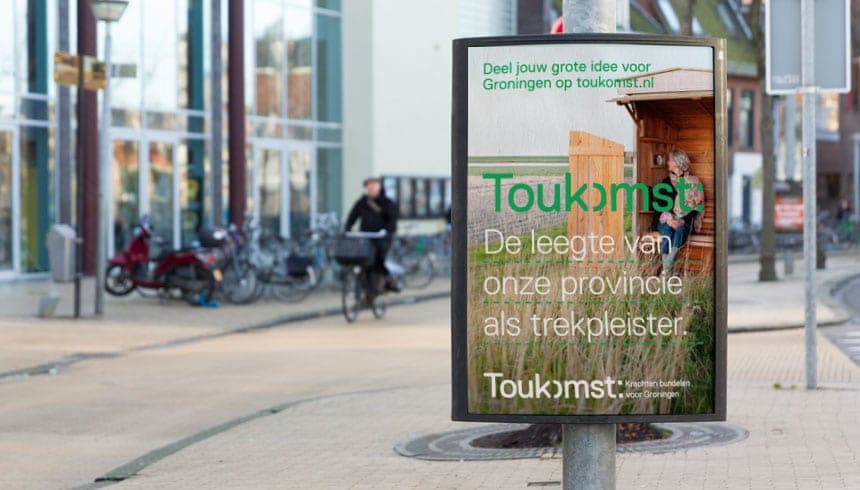 Bekijk project ↗Een publieke participatievraagstelling in het aardbevingsgebied staat voor een lastige opdracht: uitnodigen tot meedenken over de toekomst, terwijl het gesprek over Groningen al jaren wordt gedomineerd door het hier en nu van schade, gaswinning en versterking. Het inzicht dat richting gaf: wie de toekomst wil bespreken, moet eerst de taal terughalen die erbij hoort. Het Groningse woord toukomst deed precies dat — nuchter, kort, eigen. De dubbele punt erachter nodigt uit tot invullen, de subtiel weggelaten letter laat zien dat de toekomst nog niet vaststaat. Geen campagne die iets aan Groningers kwam vertellen, maar eentje die hun eigen woorden teruggaf.