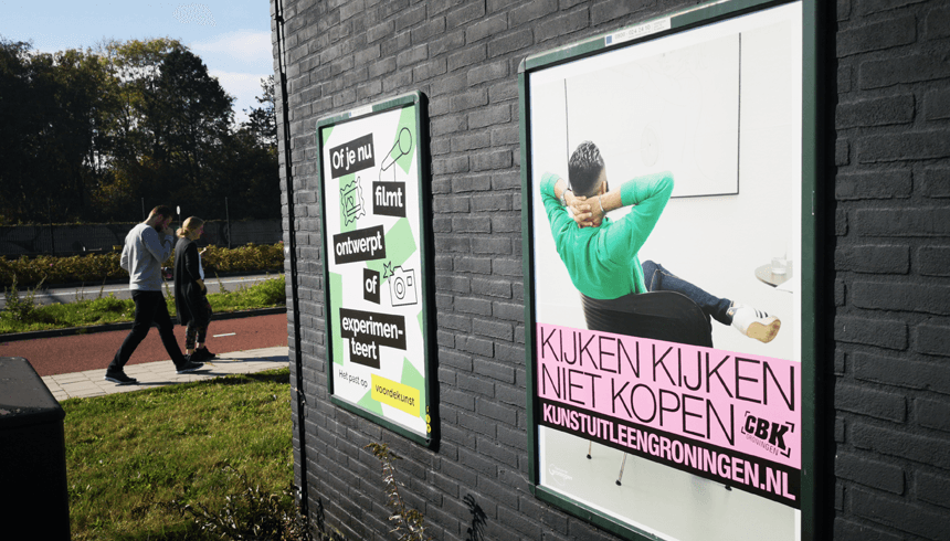 Bekijk project ↗In de kunstwereld zijn galerie en kunstuitleen twee fundamenteel verschillende proposities, maar voor wie iets aan de muur zoekt, lopen ze in de hoofd inwisselbaar door elkaar. De Kunstuitleen van CBK Groningen moest dat onderscheid in korte tijd over de bühne brengen, bij een breed publiek dat dagelijks wordt bestookt met culturele communicatie. Het strategische inzicht lag in de omkering van de propositie: niet de drempel om kunst te kopen verlagen, maar de hele aankoop overslaan.
