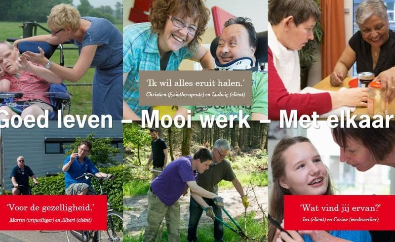 De communicatie moest die gezamenlijkheid niet uitleggen maar tonen. De pay-off 'goed leven. mooi werk.' werd uitgebreid tot 'goed leven - mooi werk - met elkaar', waarbij het verbindingsstreepje letterlijk de structuur draagt. In de fotografie staat de interactie centraal, niet de handicap. Quotes worden bewust niet toegeschreven - wie het zegt doet er minder toe dan dát het wordt gezegd.